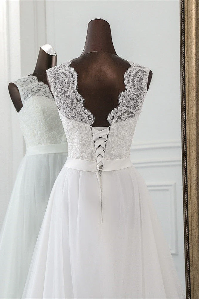 A-Line Long Sleeve Lace Wedding Dress Tulle V-Neck Zippered Back
