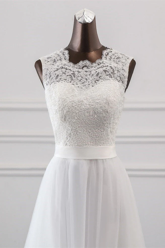 A-Line Jewel Neck Tulle Long Wedding Dress with Lace Appliques