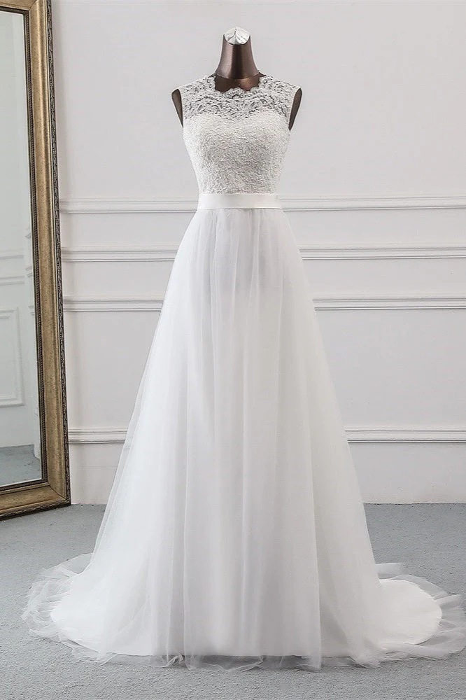 Elegant A line wedding dress featuring a jewel neck and lace appliques. Made from tulle, this sleeveless floor length gown is perfect for the modern bride. The dress is available in various sizes and colors.