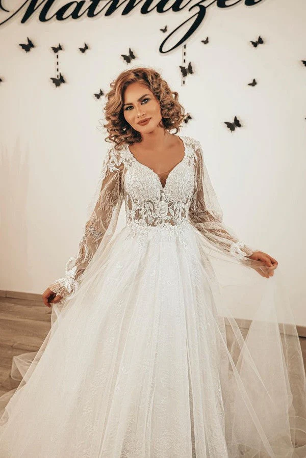 A-Line Long Sleeve Lace Wedding Dress Tulle V-Neck Zippered Back