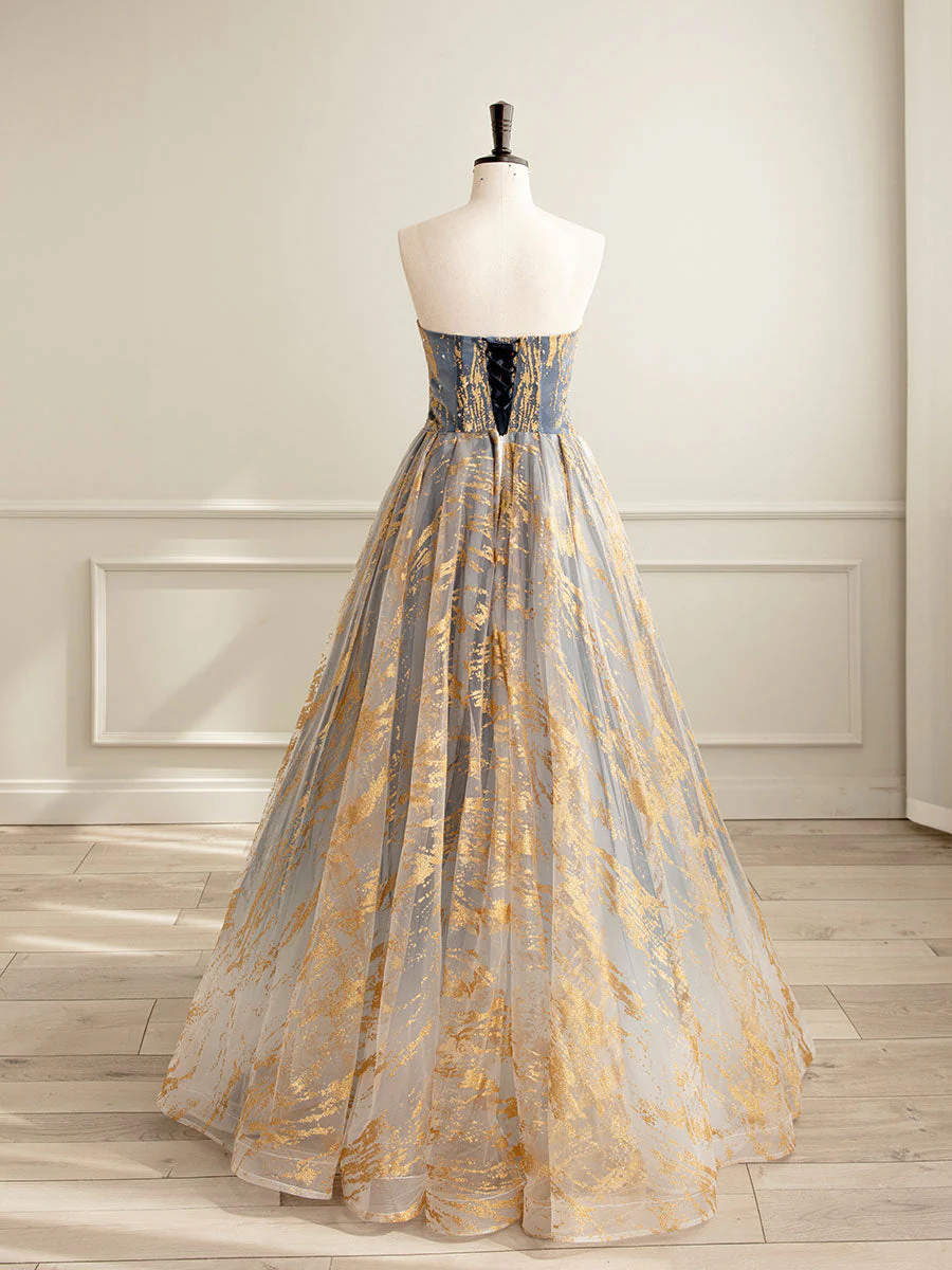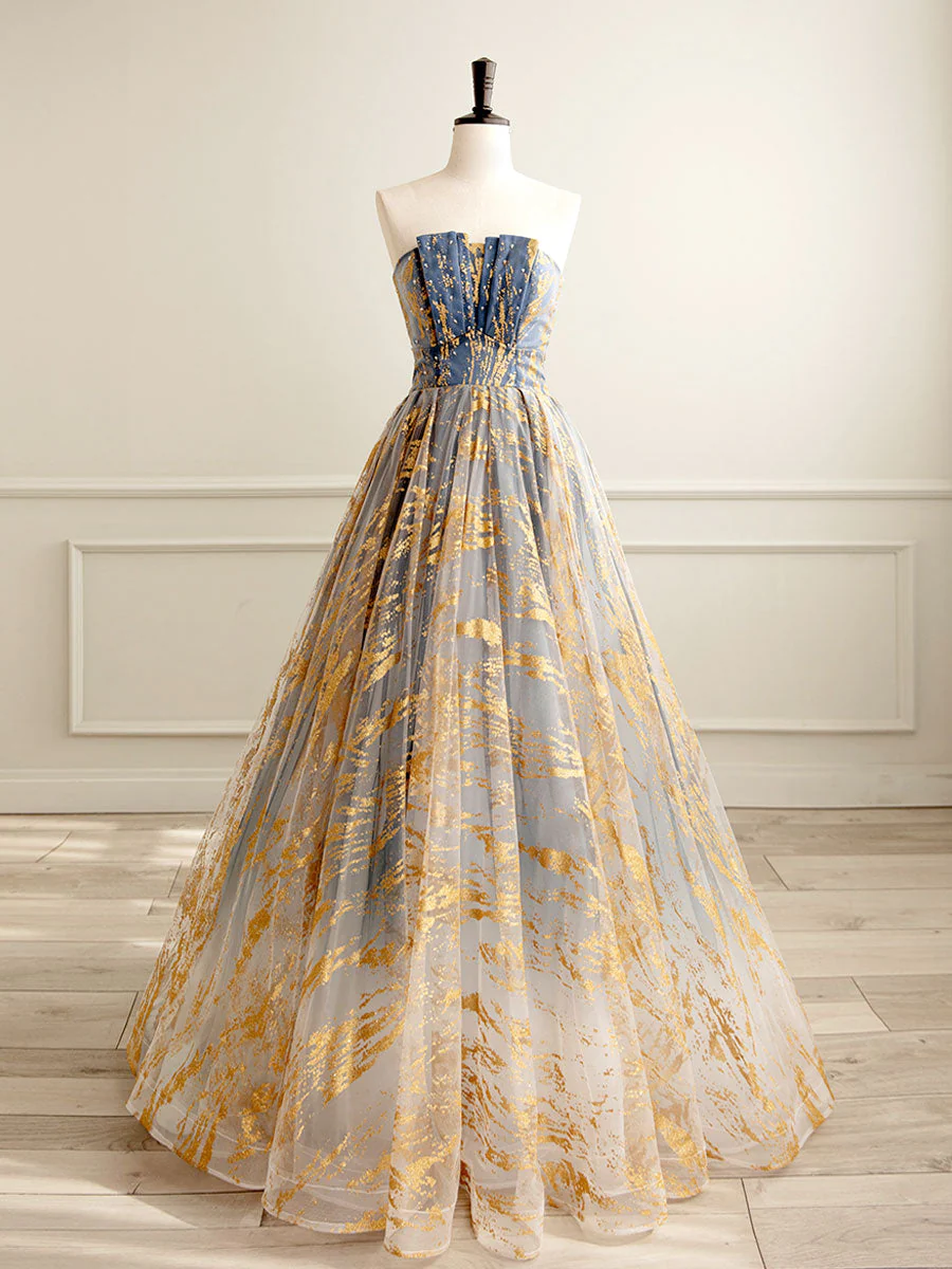 A-Line Tulle Or|Bleu Longue Robe de Bal | Robe de soirée formelle bleue