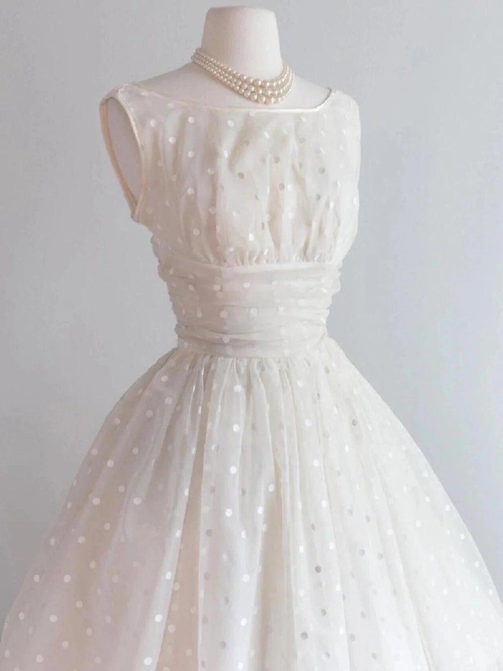 Lovely Vintage inspired Polka Dot Short Bridal Gown Material: Polka Dot Organza Neckline: Bateau Neck Length: Tea Length,Short Embellishments Style:None Sleeve Type:Sleeveless Silhouette: A-line Occasion: Wedding Pic Color: Ivory (For other colors, write the order note) Built in Bra&Bones If you need petticoat, please go below link: https://www.dollygown.com/collections/accessories