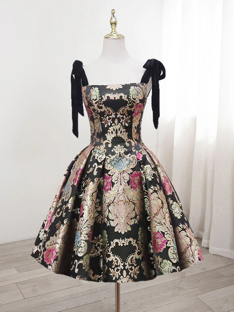 A-Line Satin Black/Gold Short Prom Dress, Black Homecoming Dress All our dresses are made to order. We accept alterations,please email us:[email protected] Material:Printed Satin Neckline: With Straps Length: Knee Length Embellishment Style:None Sleeve Type:Sleeveless Silhouette: A-line Occasion: Prom, Formal,Party Pic Color: Black (For other colors, write the order note) Full Bones&Built in Bra