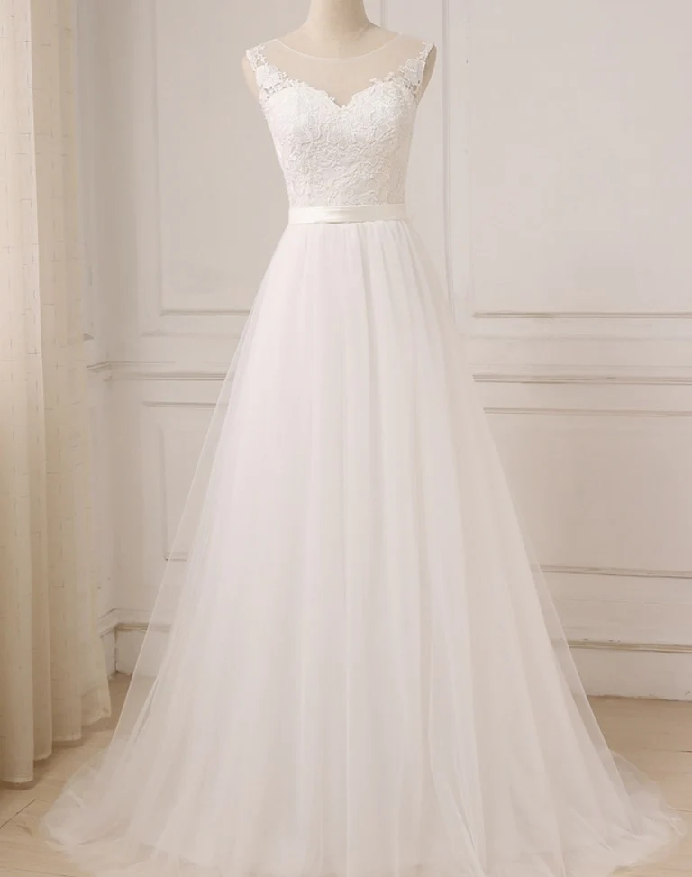 Robe de mariée trapèze avec haut en dentelle et col illusion en tulle romanrique