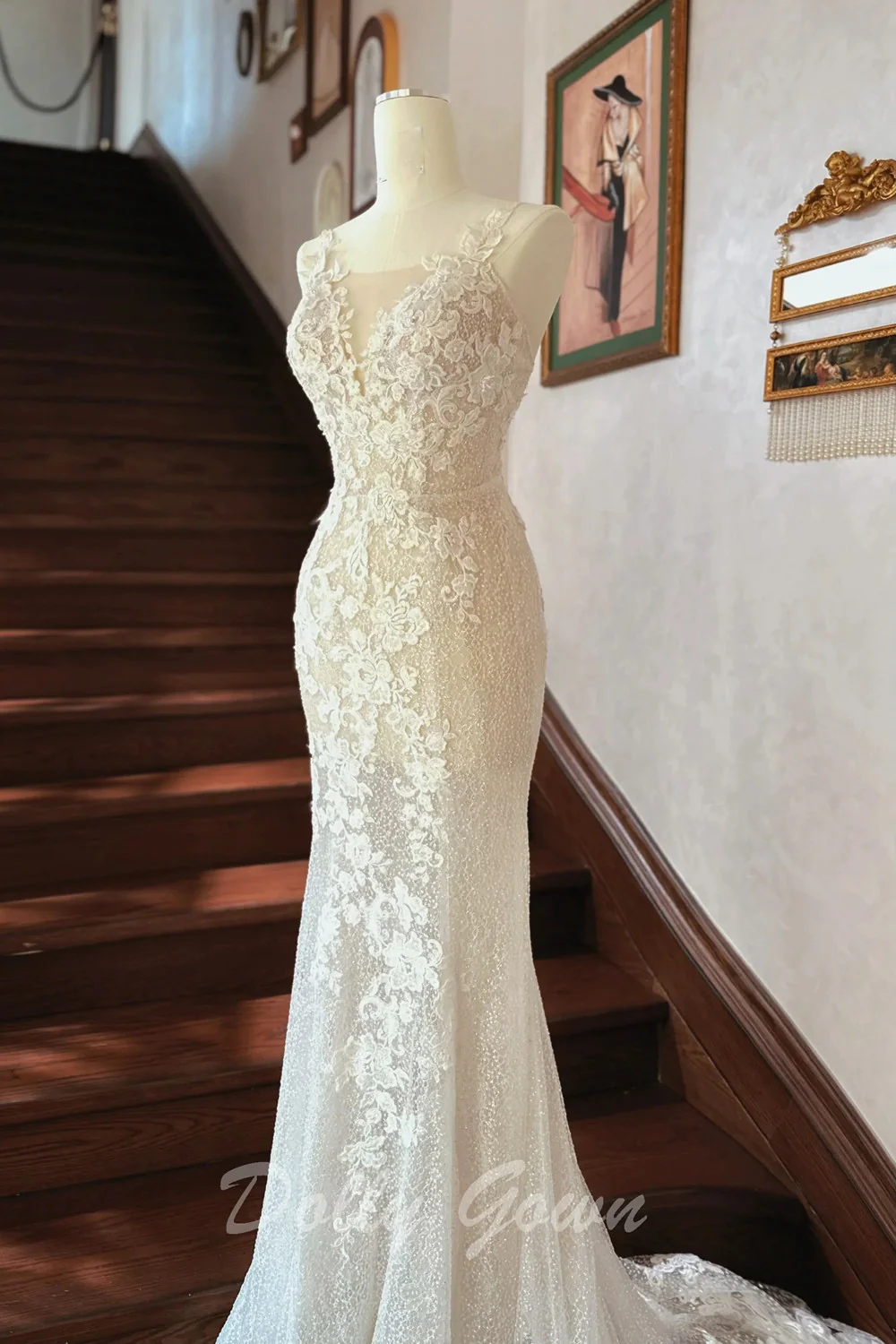 Elegant Glitter Mermaid Sheer Wedding Dress Accent with Delicate Lace Appliques