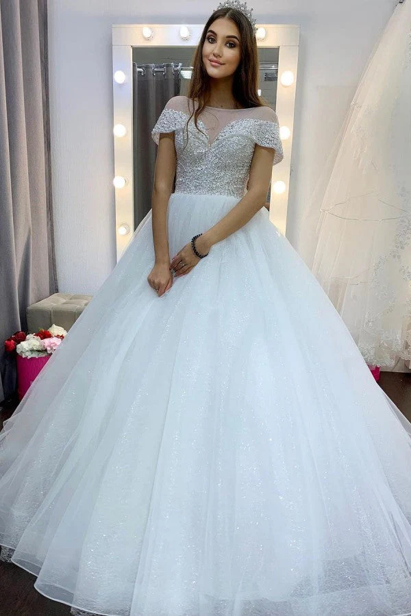 Elegant A-Line Bateau Neck Crystal Train Wedding Dress with Sequins and Tulle