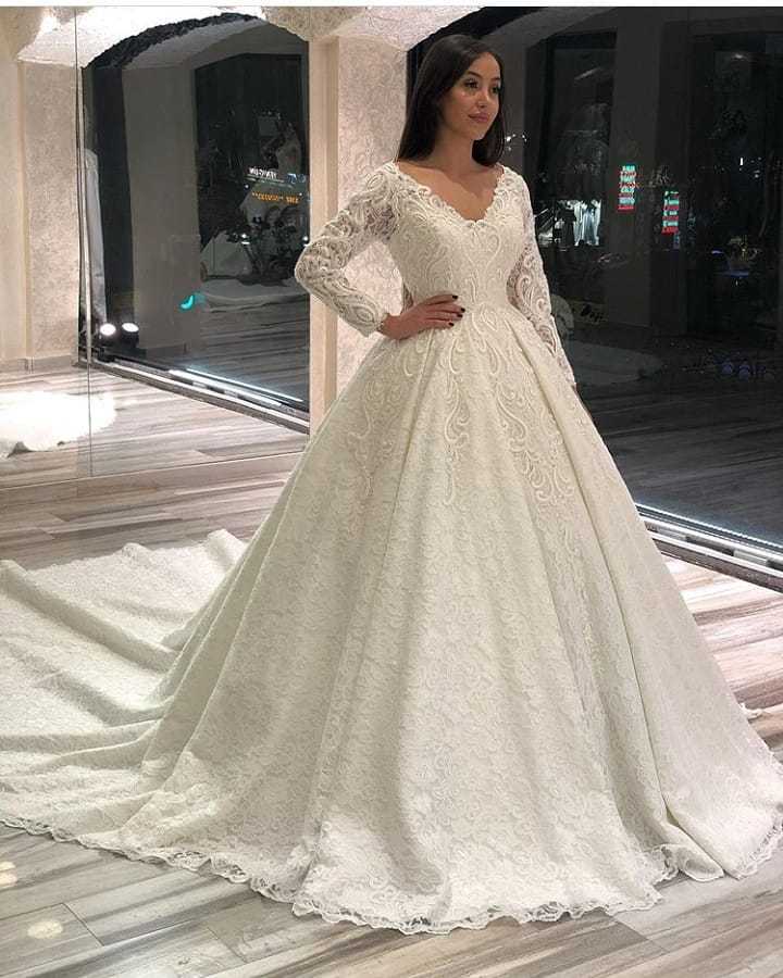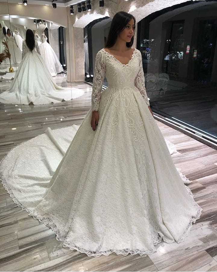 Elegant A-Line Deep V-Neck Lace Appliqued Long Sleeve Wedding Dress