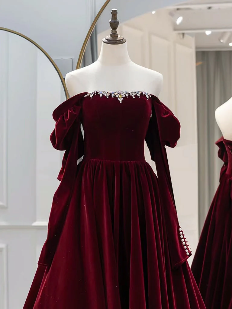 Elegant A-Line Long Sleeves Velvet Burgundy Prom Dress with Exquisite Beads