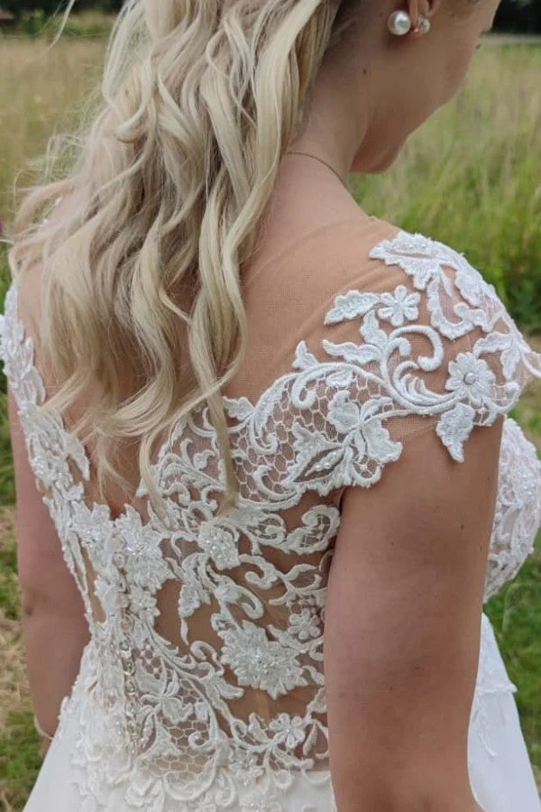 This sleeveless A line chiffon wedding dress is the perfect choice for your special day. This gown features delicate appliques and lace straps that add a touch of elegance. The flowing chiffon fabric creates a romantic and ethereal look. With its timeless silhouette, this dress will ensure you look and feel amazing as you walk down the aisle.