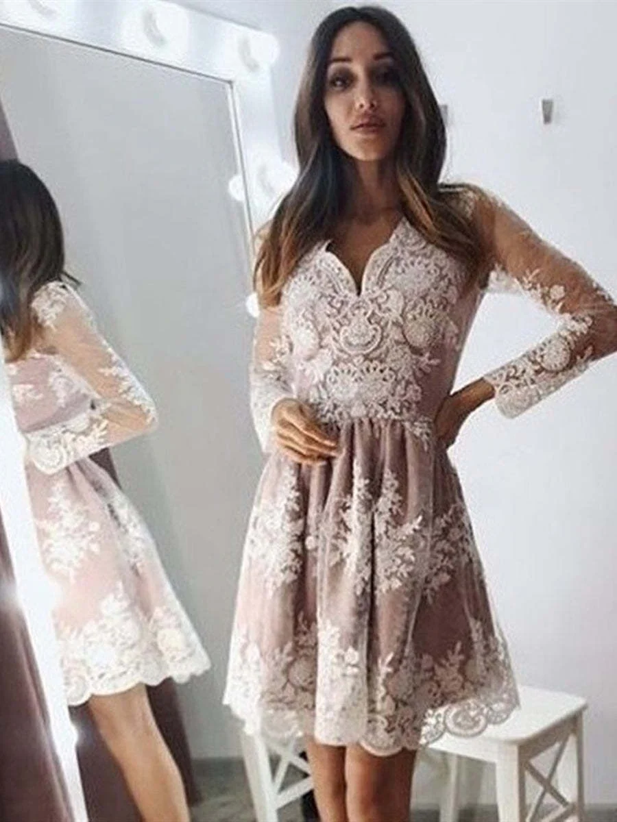 Elegant Champagne Lace Short Prom Dress with Long Sleeves & V-Neck Design