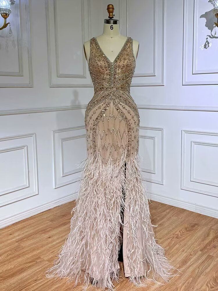 Green Sequin Prom Dress Long Beaded V Neck With Feather Details