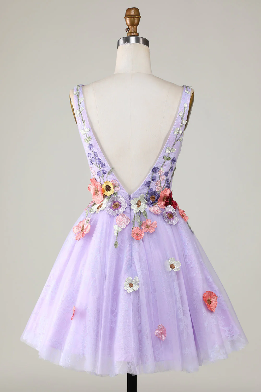 Lilac Colorful 3D Floral V-Neck Backless Homecoming Dress