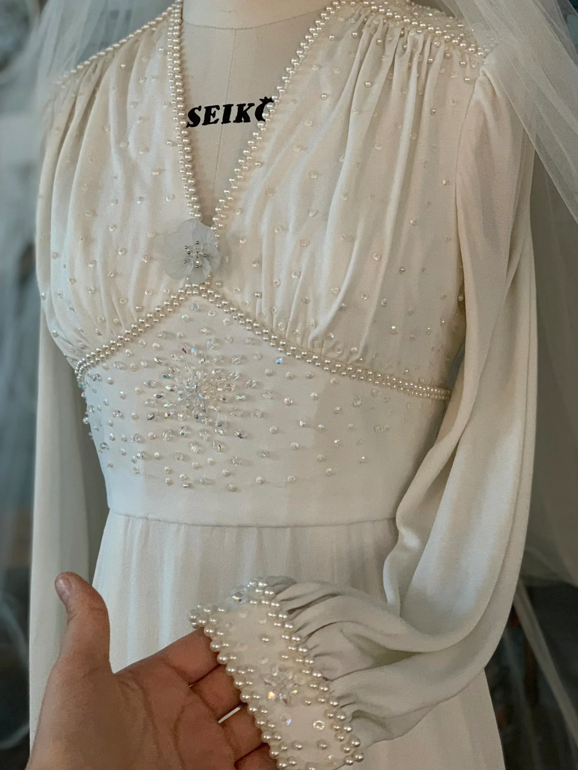 Look at this dress If you’re specifically looking for a modest vintage wedding dress with long sleeves from the 70s,the long sleeves provide coverage and a vintage appeal. Material:satin chiffon Neckline: V-neck Length: floor Sleeve Type:long sleeve Silhouette: A-line Occasion: wedding Pic Color: ivory(For other colors, write the order note)