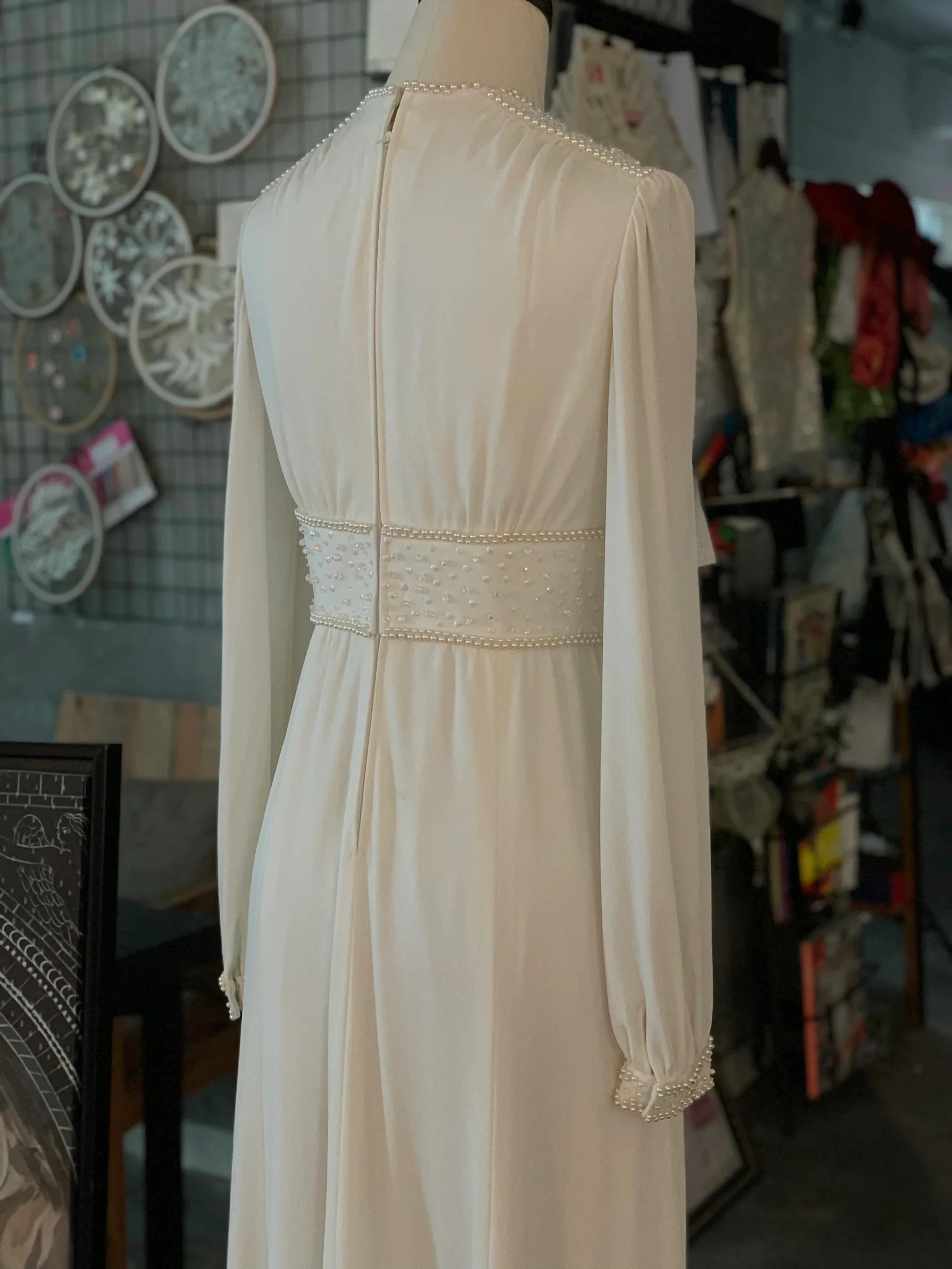 Look at this dress If you’re specifically looking for a modest vintage wedding dress with long sleeves from the 70s,the long sleeves provide coverage and a vintage appeal.