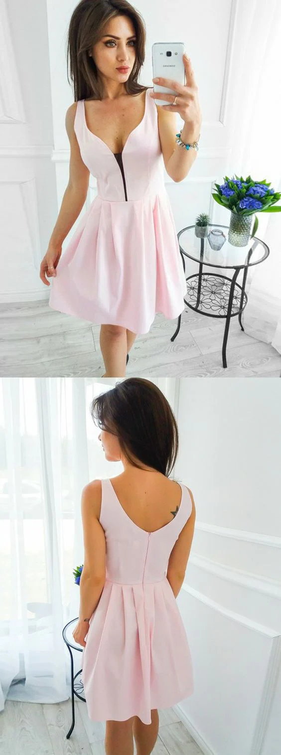 Robe de bal courte rose clair simple, col en V profond, robe de première année