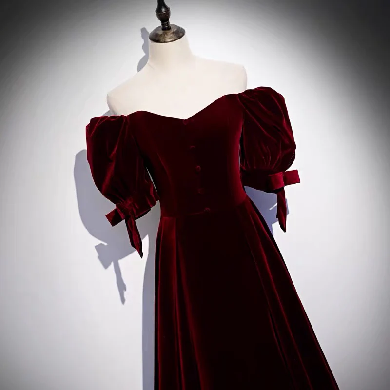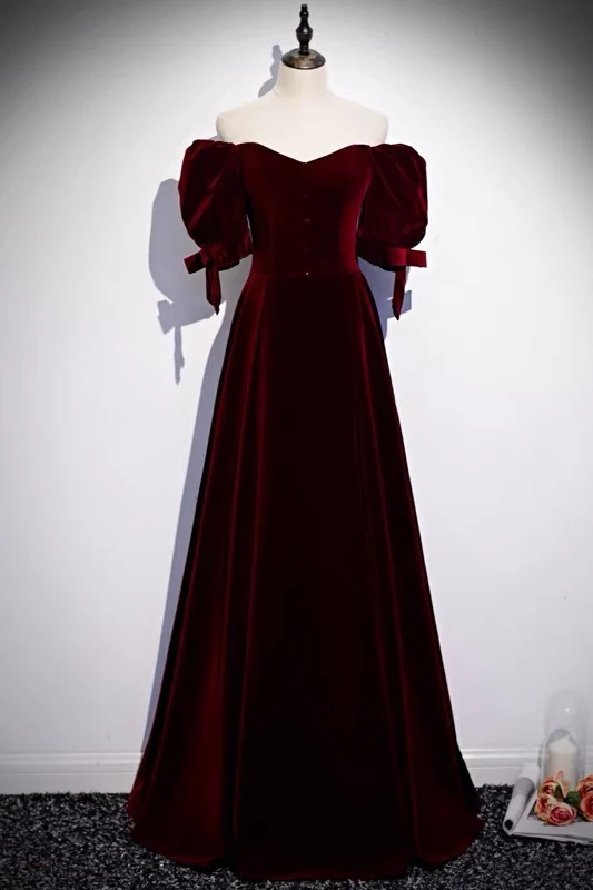 Robe de bal longue en velours à épaules dénudées et manches bouffantes
