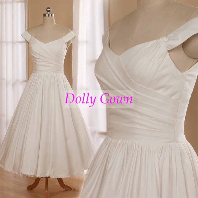 Robe de mariée en coton à épaules dénudées, inspirée des années 1950, longueur thé, avec ourlet en dentelle