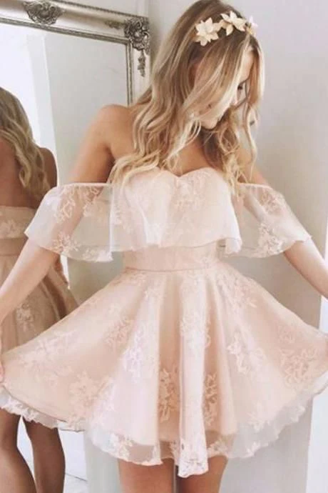 Robe de soirée courte en dentelle rose perle, épaules dénudées, robe de danse pour remise de diplôme de 8e année