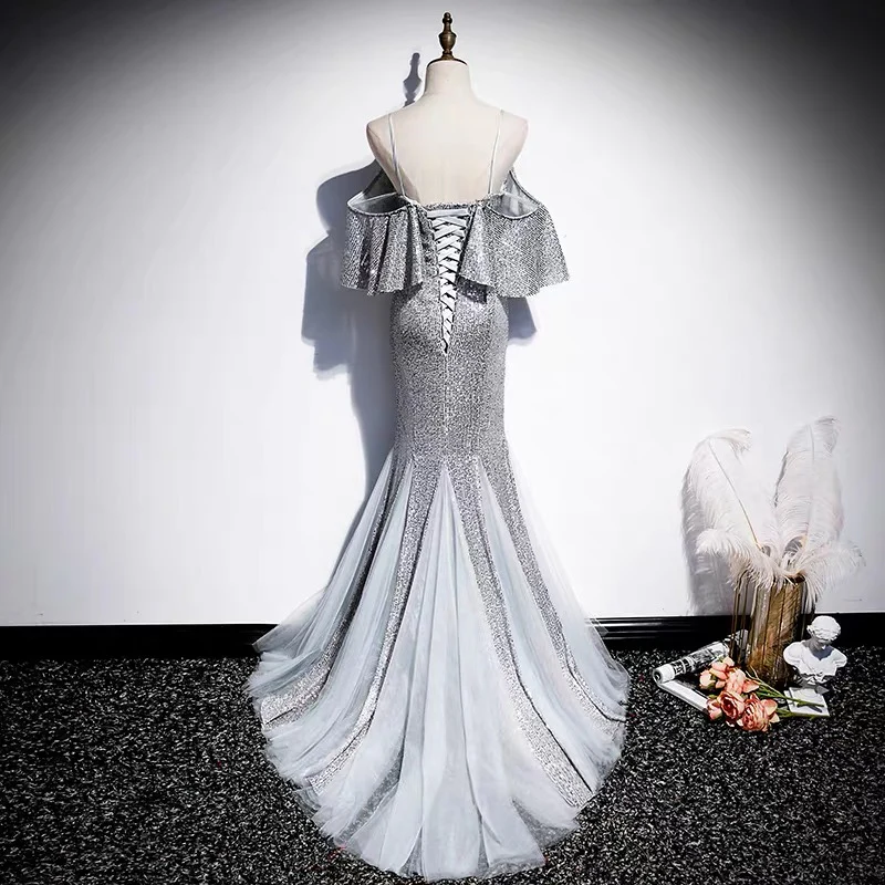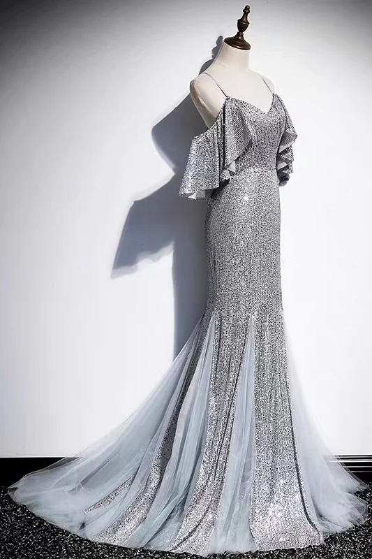 Robe de bal sirène à paillettes argentées et épaules dénudées avec bretelles spaghetti.
