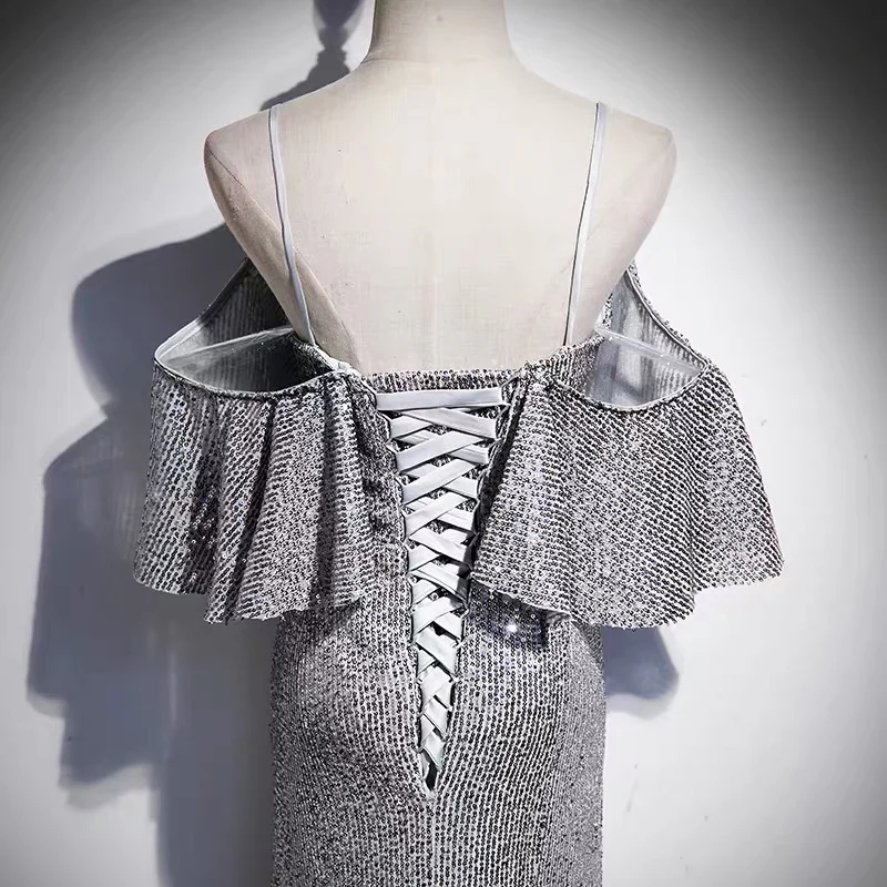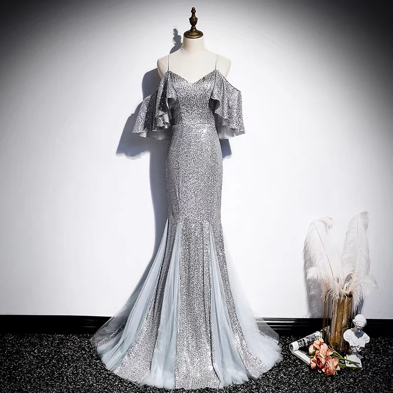 Robe de bal sirène à paillettes argentées et épaules dénudées avec bretelles spaghetti. Matériel: Paillettes Encolure: col en V Longueur : train de cour. Style d’épaule: hors de l’épaule Silhouette: sirène Occasion: Bal de promo, tapis rouge, concours de beauté, mère de la mariée, cérémonie