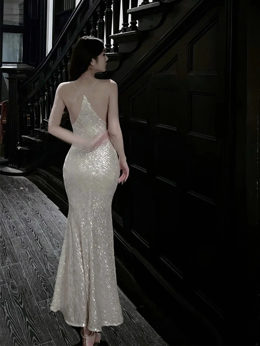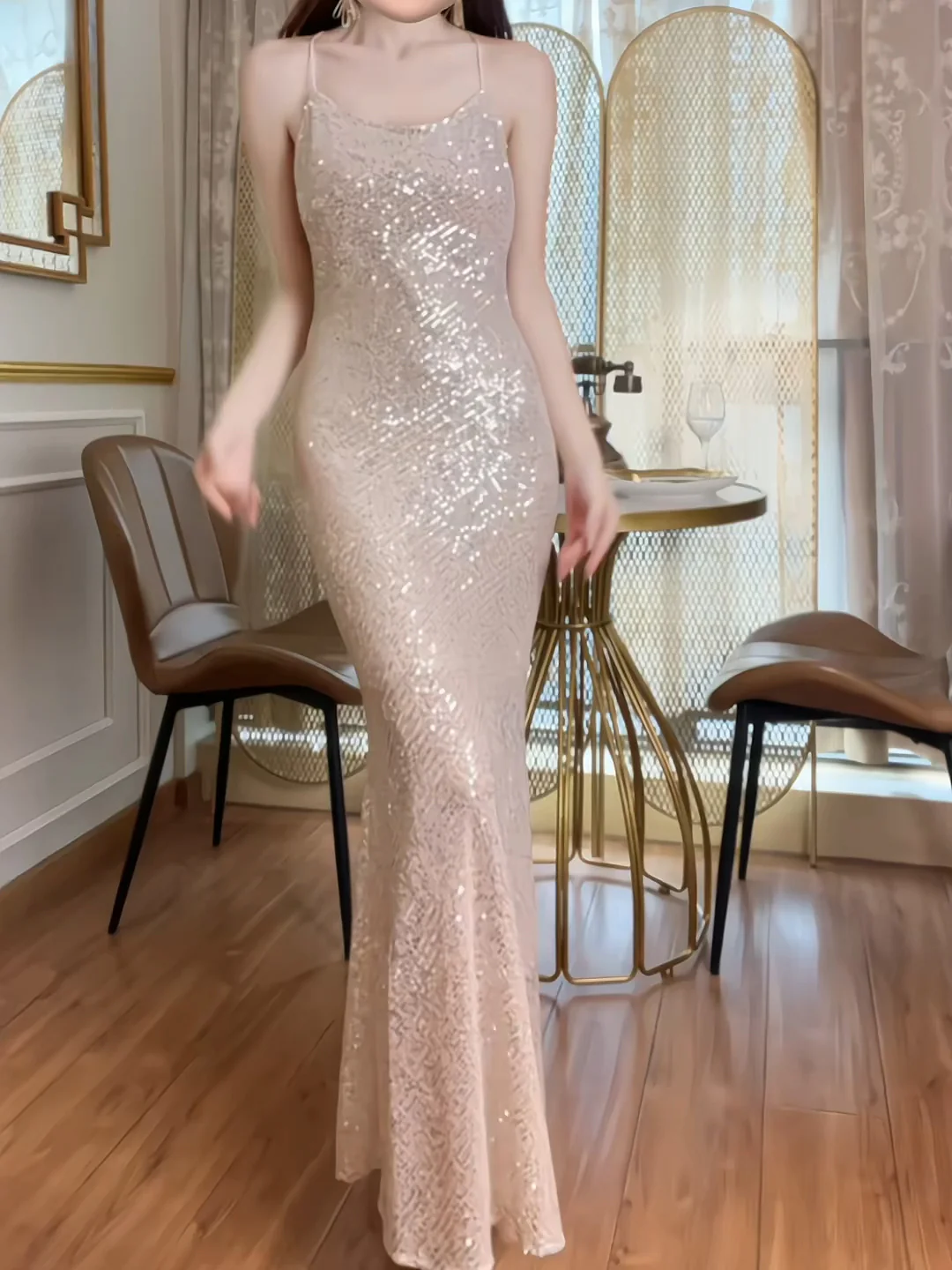 Robe longue sirène à paillettes et paillettes roses