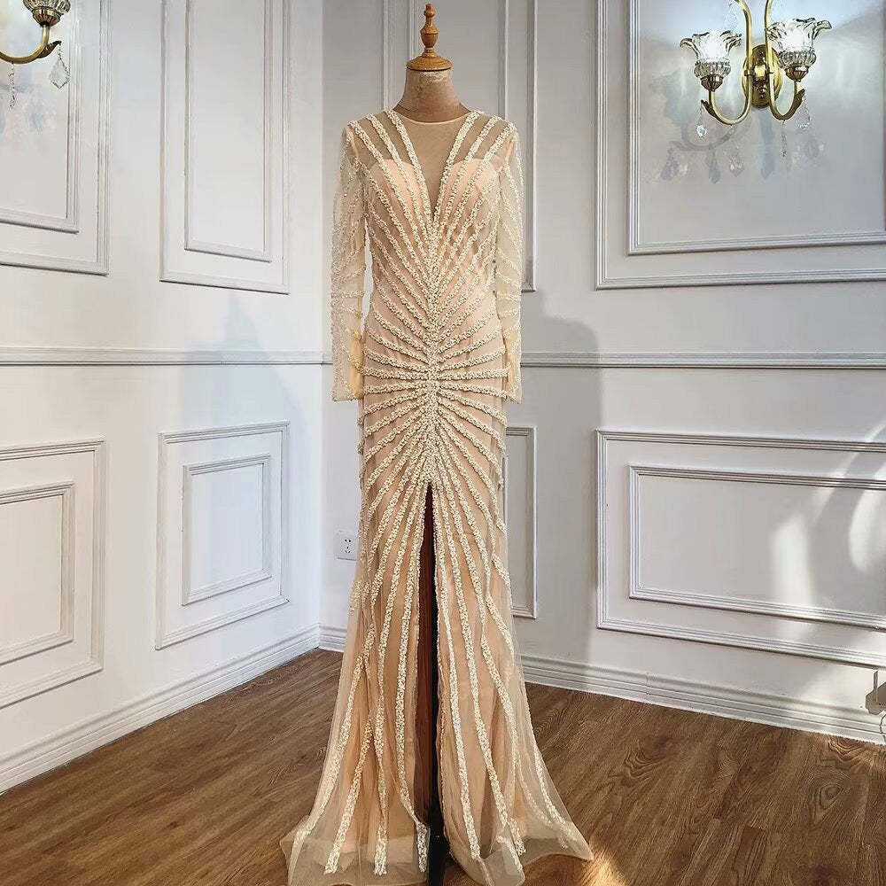 This dress is a showstopper, with its black sequin details and long sleeve mermaid silhouette. The V neck adds a touch of elegance, making it perfect for formal events. With a high slit, this dress is sure to turn heads. Whether you’re attending a prom or a wedding, this dress is sure to make you feel like a princess. The long sleeve design and mermaid shape create a flattering and sophisticated look.