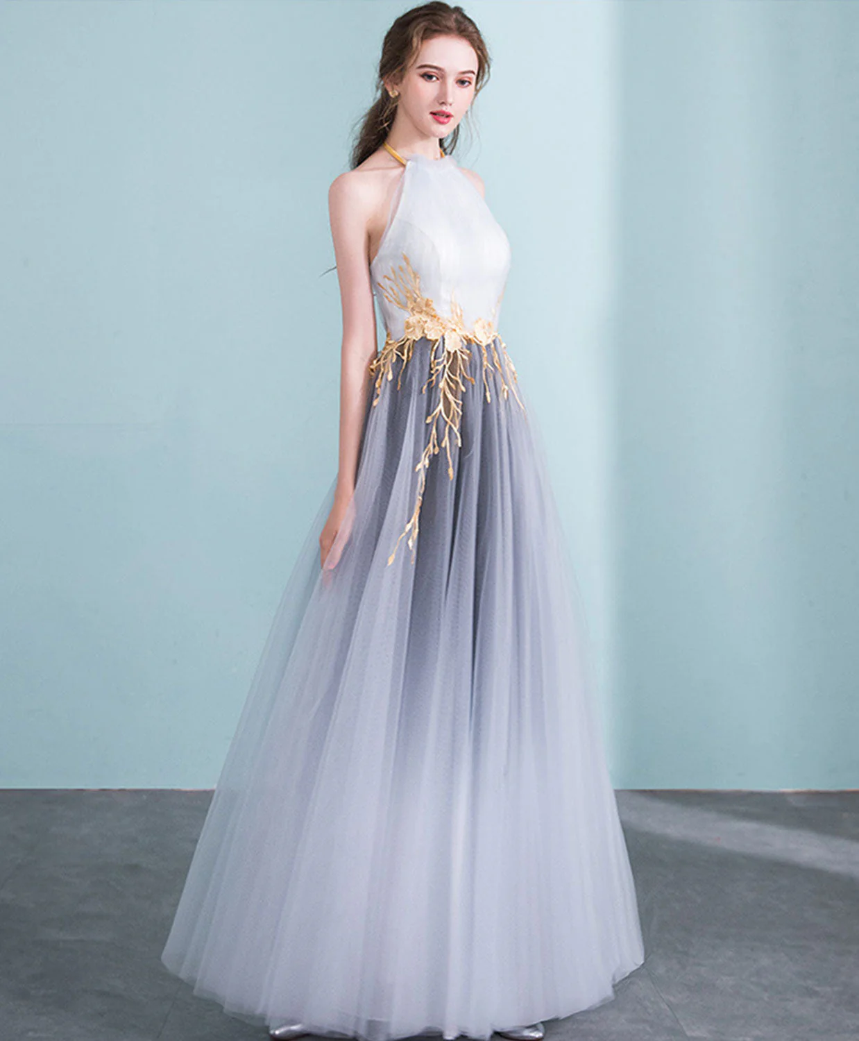 Stunning Gray Gradient Halter Neck Tulle Evening Dress