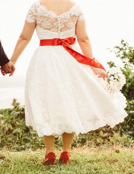 Robe de mariée longueur thé en dentelle à mancherons avec ceinture rouge.